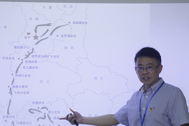 董维从遵义会议召开的历史背景、遵义会议召开的具体过程和维护遵义会议决议与长征胜利等方面进行详细讲解。首先用一张红军长征地图为大家理清了遵义会议的前后历史事件,接着详细介绍了遵义会议的基本情况、会议过程、会议决议等内容。董维强调遵义会议确立了毛泽东同志在党中央和红军的领导地位,开启了我们党独立自主解决中国革命实际问题的新阶段,标志着中国共产党从幼年走向成熟。讲授后全体老师一起观看了遵义会议的视频。