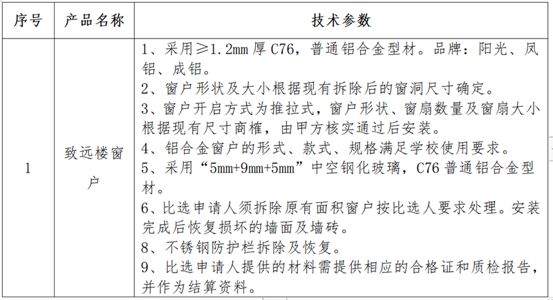 (一)将致远楼窗户原有普通玻璃更换为C76铝合金型材“5mm+9mm+5mm”中空钢化玻璃窗户约800㎡(以实际收方为准)。