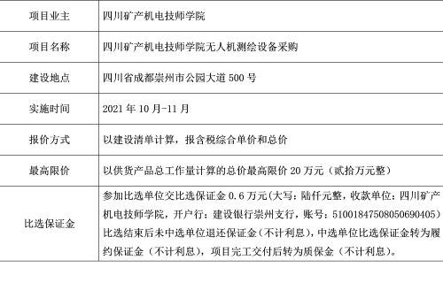 四川矿产机电技师学院根据专业教学需要拟开展无人机测绘设备采购,按照学院设备采购相关规定及国家有关法律法规的要求,确定通过开展内部比选确定服务单位,诚邀符合条件的单位参与本项目的比选。