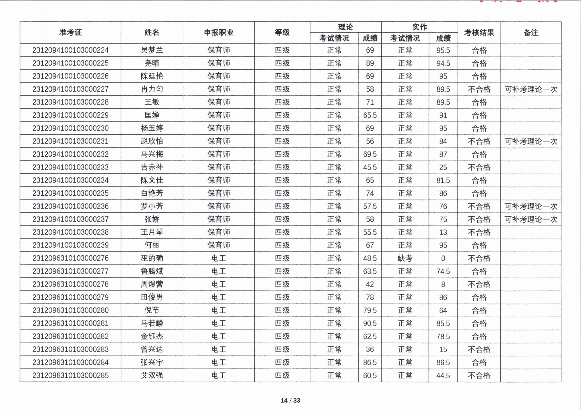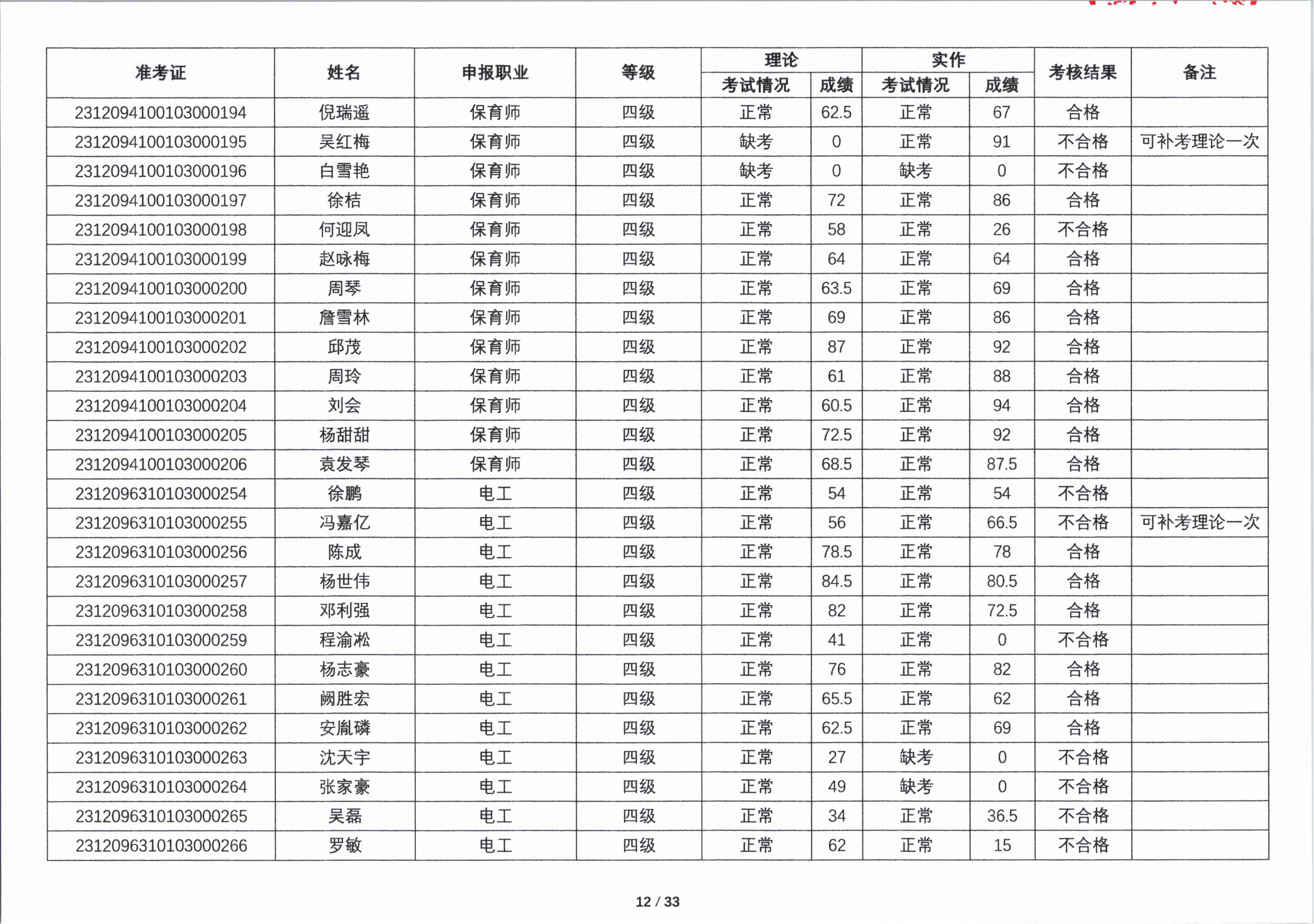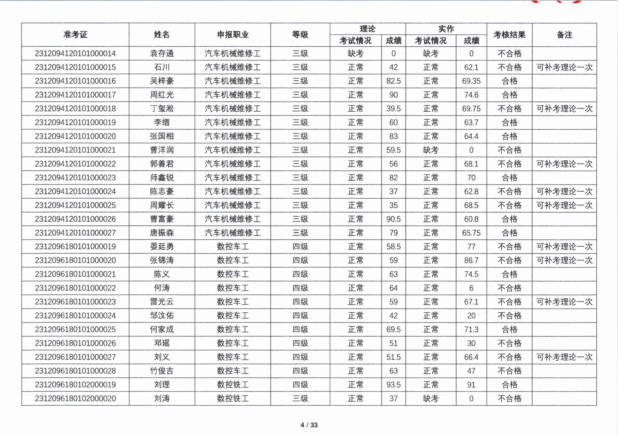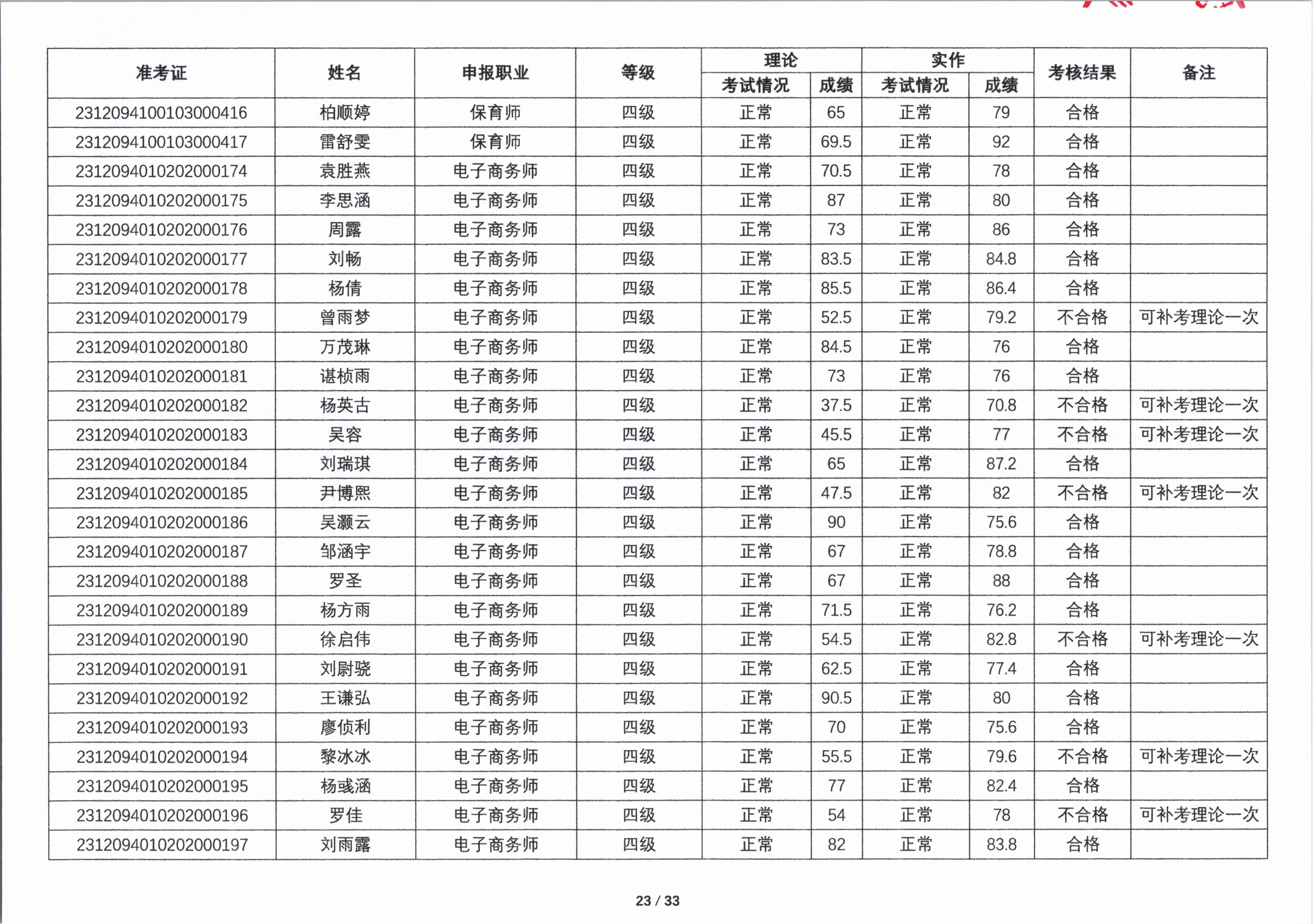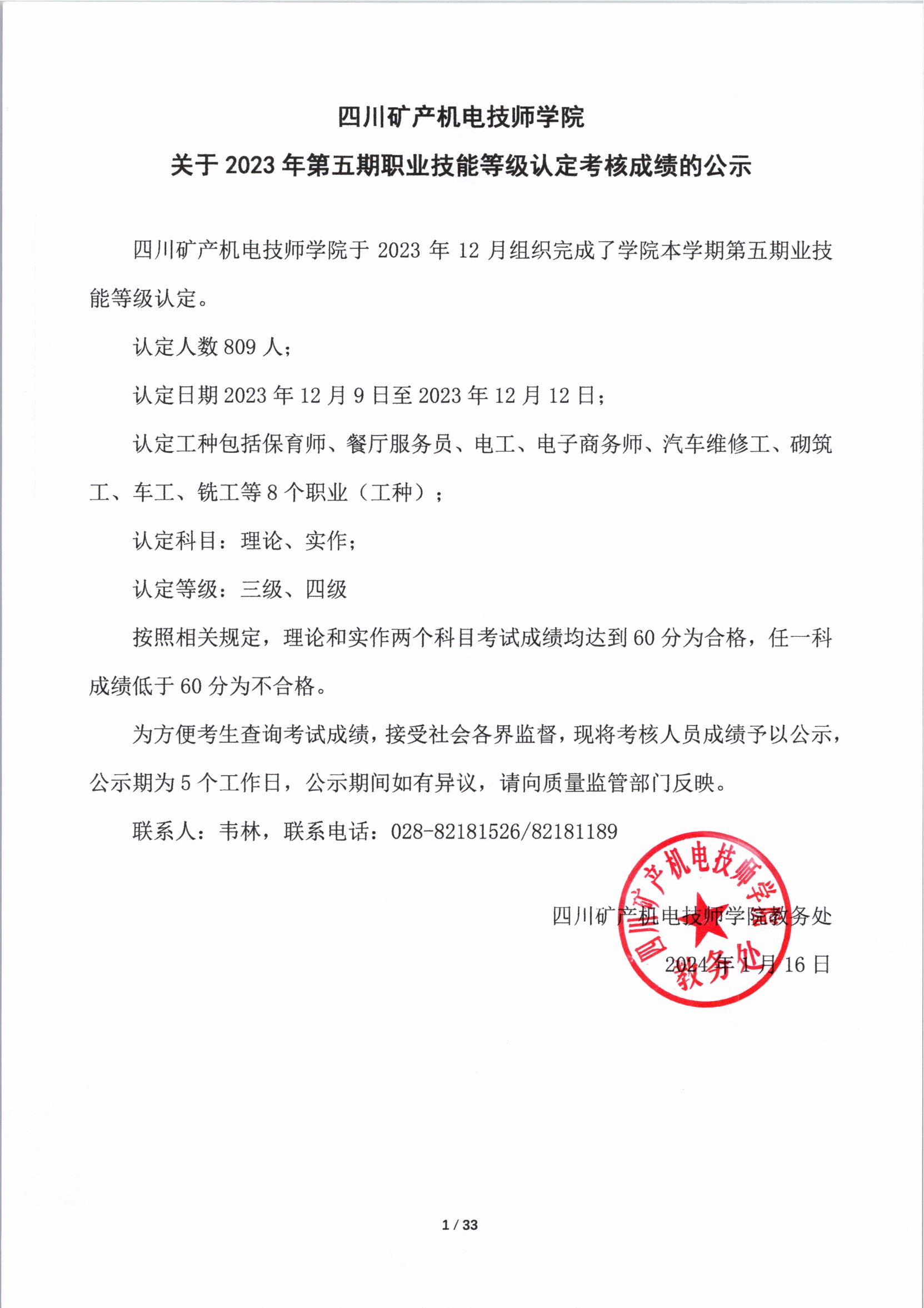 关于2023年第四期职业技能等级认定考核成绩的公示