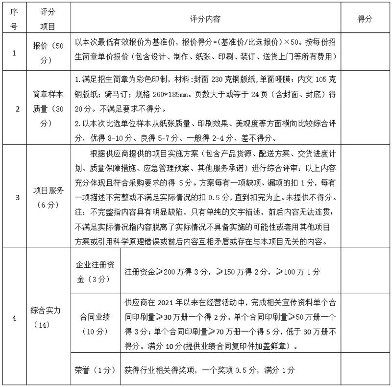 (一)在符合资格要求的比选申请人中,按综合评分法(报价、简章样本质量、项目服务、综合实力)确定中选单位。
