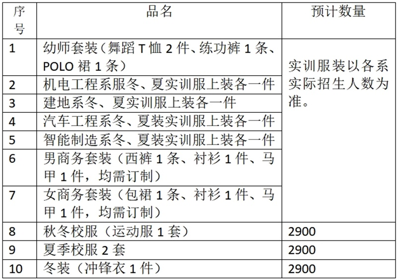 (二)比选内容:本次招标的内容为校服和实训服装(因到校报到学生数不能确定,故总数以实发为准)