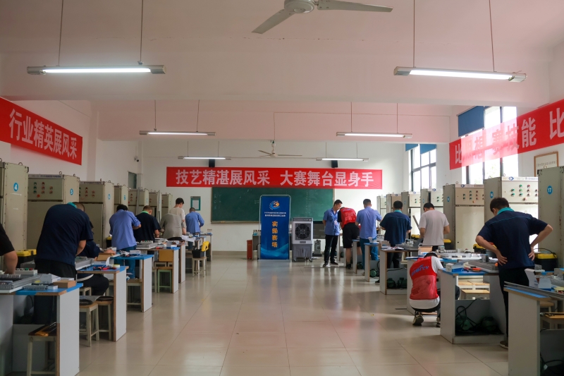 比赛为期两天,分设理论与实操两大考核模块,理论部分聚焦机电设备安装规范、安全操作流程及设备原理知识;实操部分重点检验设备安装精度、电气线路接线工艺、通电调试效率及故障排查能力,全程禁用电动工具。