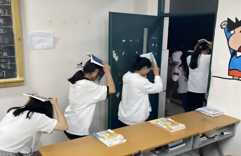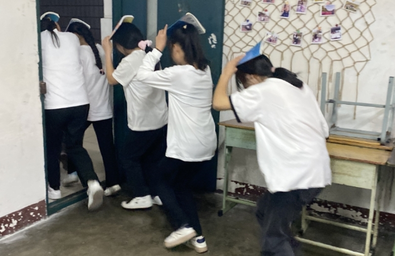为了进一步强化全班同学的防火防震减灾意识,保证全体成员在突发地震火灾时快速、有序、高效地应急避险和疏散,在主题班会最后一个环节,全班组织进行了防震应急疏散演习。