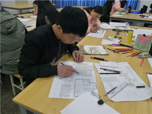 决赛于12月8日上午在建筑实训中心制图室进行,决赛题目是以“家,人,环保”为主题的小户型设计,参赛选手从审题、构思,到平面布局图和效果图的绘制,再到设计说明的书写以及最终的排版都紧张有序的进行。比赛完成后,由管理工程系老师赖良杰,邹潇楚,张涵语对决赛作品从手绘技巧、功能布局、设计构思、图纸规范等方面进行了全方位的评比,最终评选出一等奖、二等奖和三等奖共6名同学,获奖名单如下: