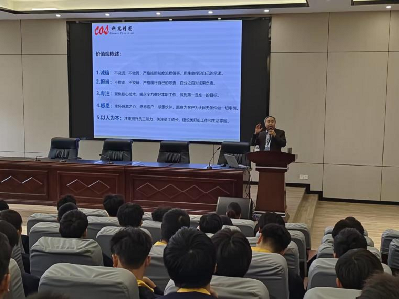 邓兴强介绍了公司的核心价值观:诚信、担当、专注、感恩以及以人为本。他表示公司以引领精密制造,助推客户智造精彩世界为使命。