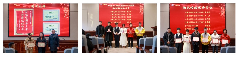 助农实战项目表彰环节,指导老师邱孟介绍,文井江镇政府牛尾笋公益助农项目线上线下发力,累计销售牛尾笋超3000斤,运营账号核心数据超越90%同级别作者,助力官方账号涨粉至2000,并解锁直播带货权限。陈火琴、吴刘鹏等同学参展的短视频《笋尖实践行,助农成长记》在四川省技工院校首届校园文化活动周中获二等奖,何刘、邱孟老师被授予助农大使称号。