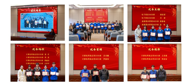 经管实战商学堂指导老师何刘分享团队成绩。该团队2025年8月组建,由何刘、邱孟指导,28人分设主播、剪辑、摄影、场控四组,累计发布视频103个、总浏览量超13万次,开展直播109场并自主创收,还助力机电工程系、汽车工程系开展宣传直播。表彰环节,计算机网络应用专业张佳洁、刘玲等获积极分子奖,吴刘鹏、罗棋伟等获优秀奖。