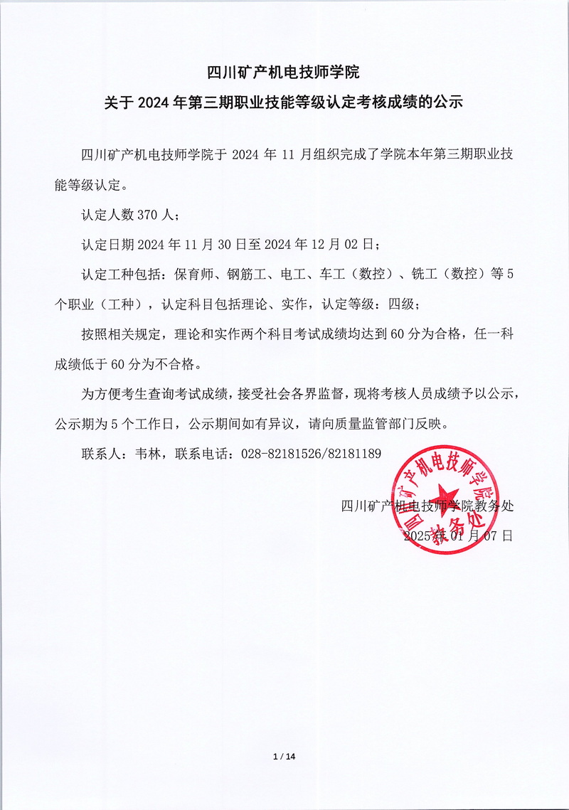 四川矿产机电技师学院关于2024年第三期职业技能等级认定考核成绩的公示