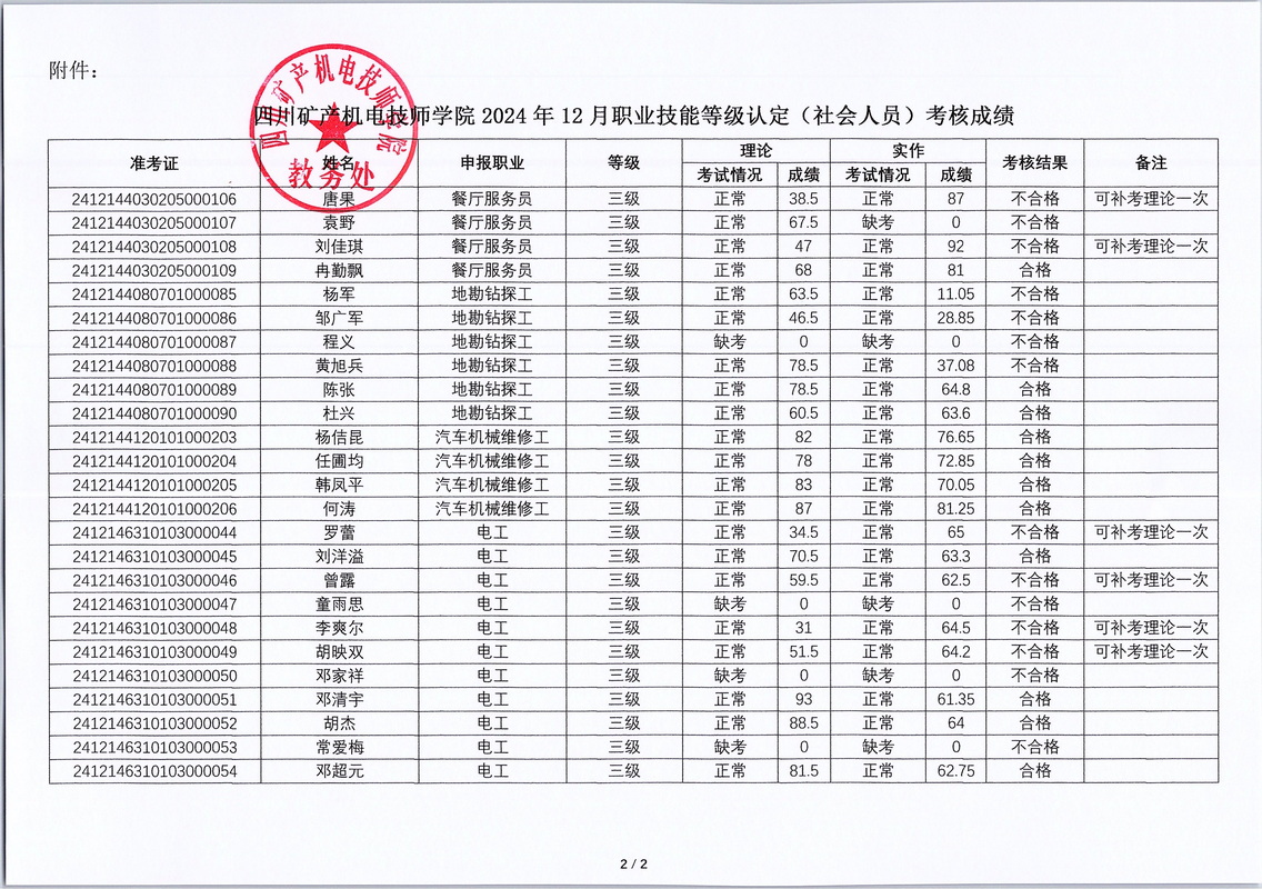 四川矿产机电技师学院关于2024年第四期(学生)职业技能等级认定考核成绩的公示