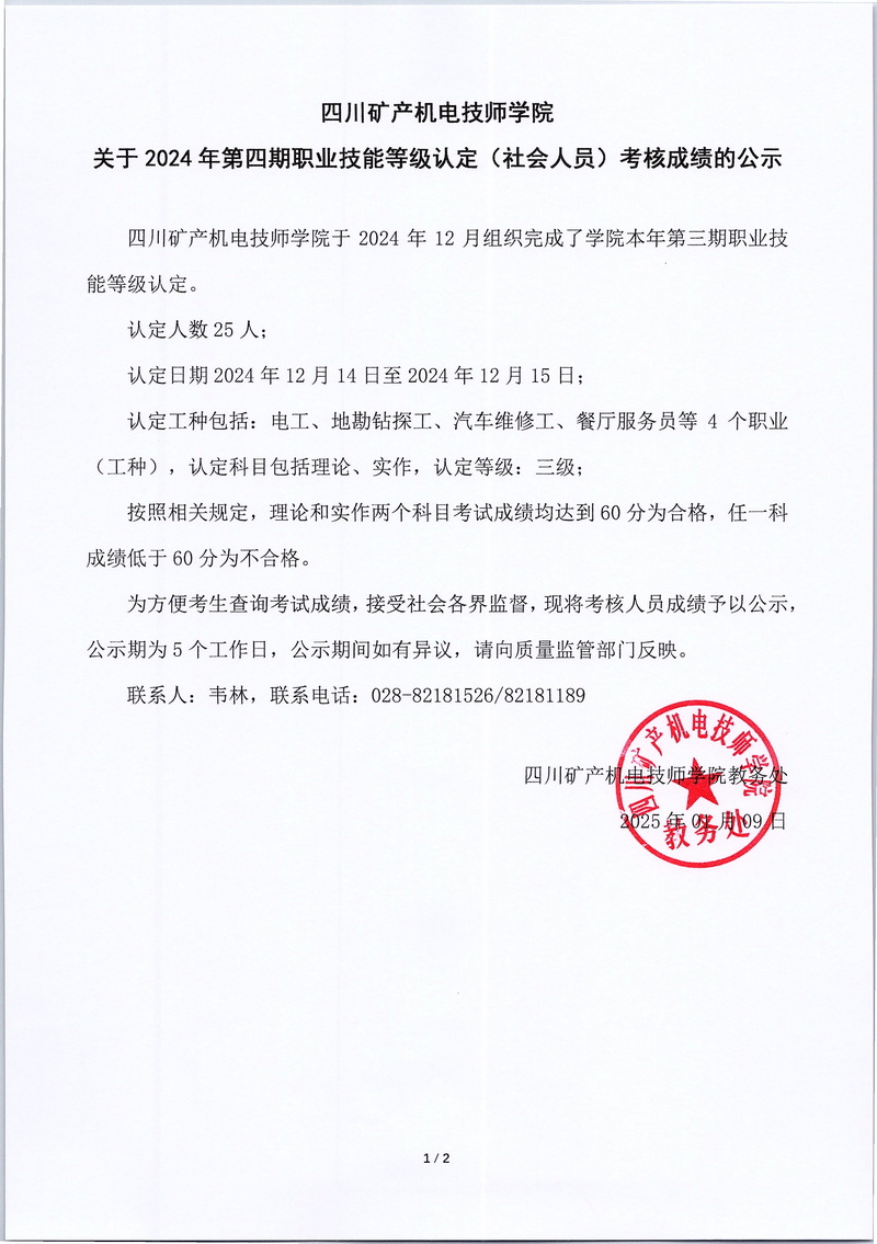 四川矿产机电技师学院关于2024年第四期(社会人员)职业技能等级认定考核成绩的公示