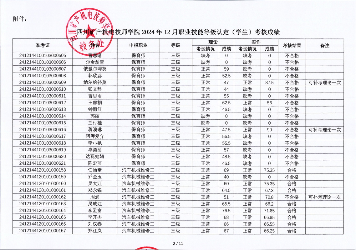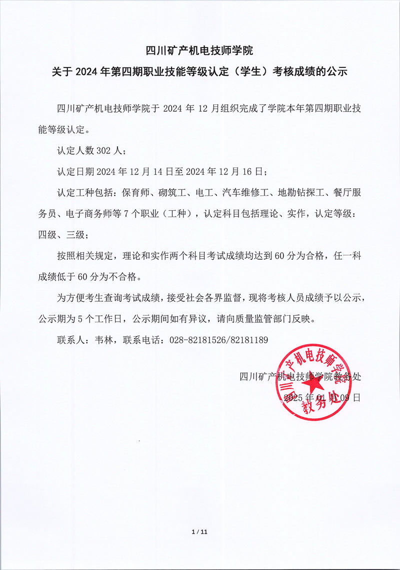 四川矿产机电技师学院关于2024年第四期(学生)职业技能等级认定考核成绩的公示