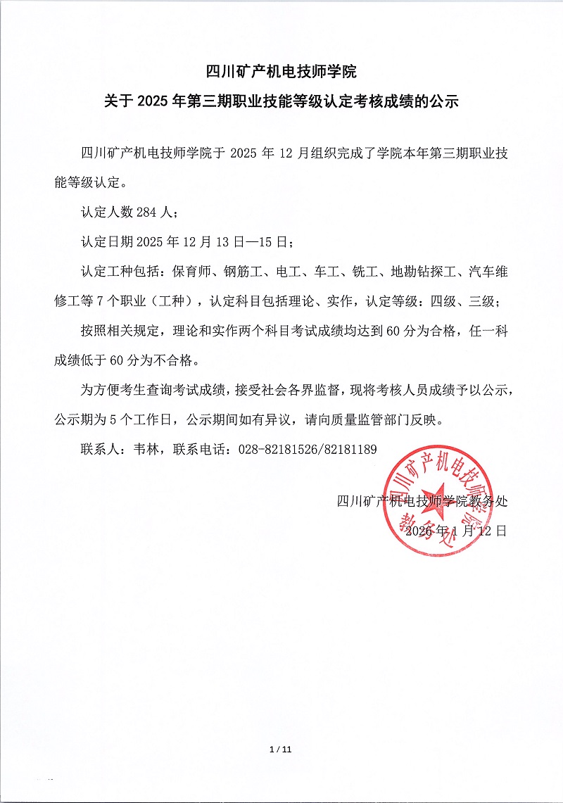 四川矿产机电技师学院关于2025年第三期职业技能等级认定考核成绩的公示
