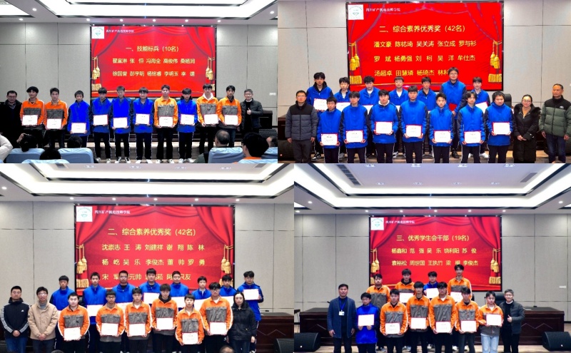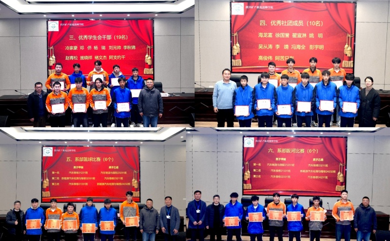 大会对2024年度获得“技能标兵”、“综合素养优秀奖”、“学生会优秀干部”、“优秀社团成员”、“优秀裁判”的优秀个人以及“体育活动比赛奖”、“文明寝室”、“优秀班集体”优秀集体进行了表彰。参会教师为优秀个人和优秀集体学生代表颁发了荣誉证书。