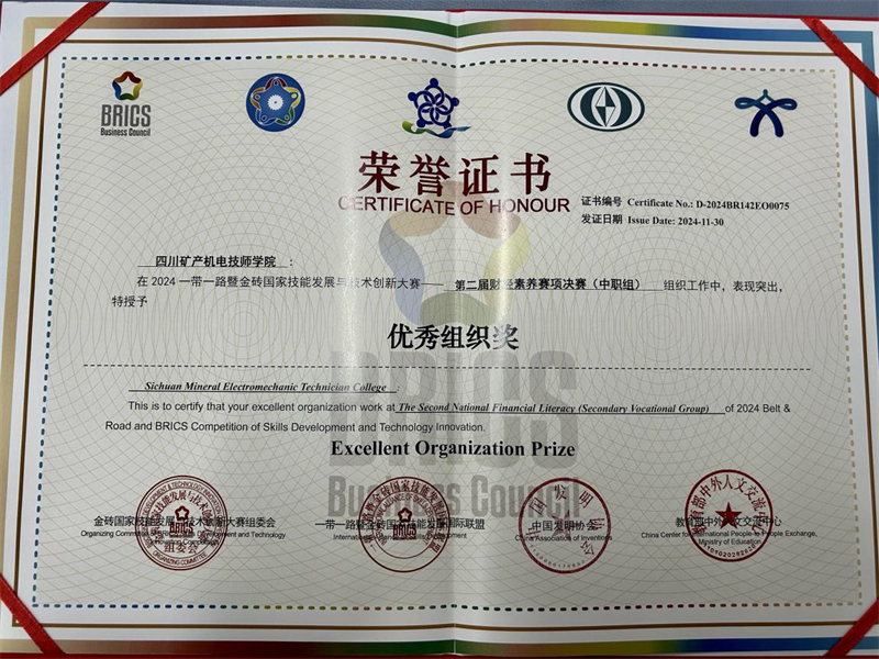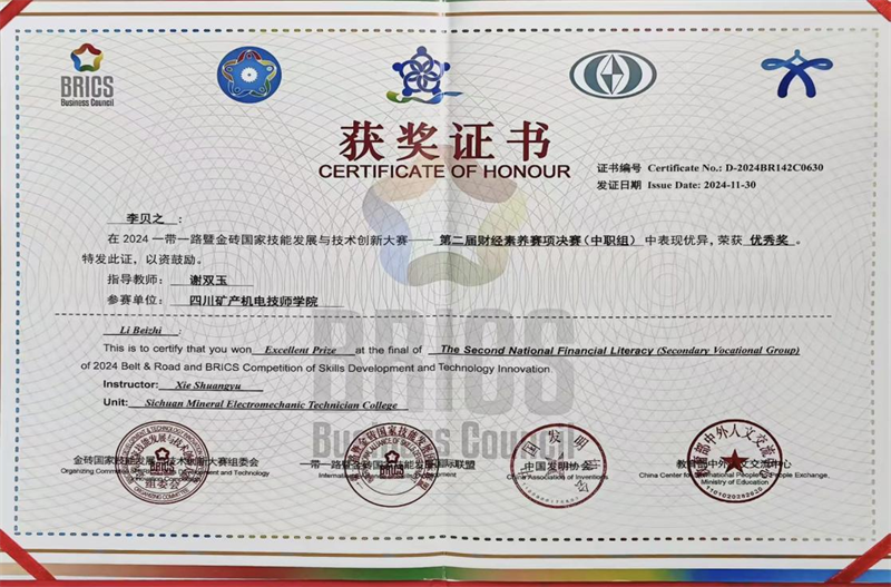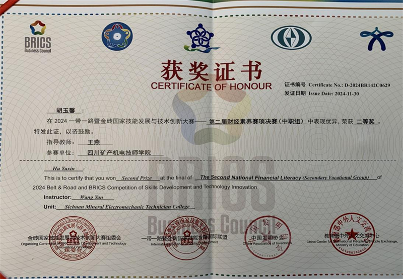 近期,“2024“一带一路”暨金砖国家技能发展与技术创新大赛”第二届财经素养赛项决赛全国总决赛成功举办。我院2023级会计专业学生胡玉馨、李贝之在决赛中经过激烈角逐,分别荣获国内中职组二等奖和优秀奖,学院被授予“优秀组织奖”,王燕老师荣获“优秀指导教师”。