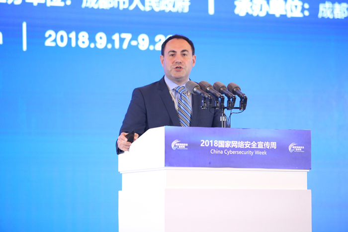 图为卡巴斯基实验室全球亚太区公共事务负责人奥列格·阿卜杜拉希托夫就《地缘政治、网络安全、信息透明》发表演讲。中国网信网 李旭 摄