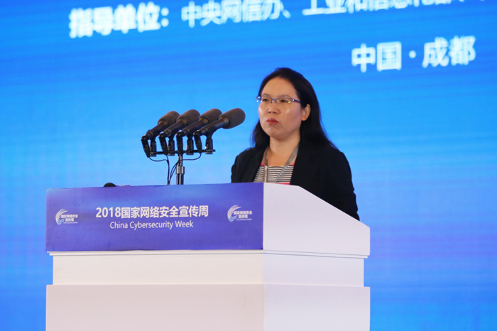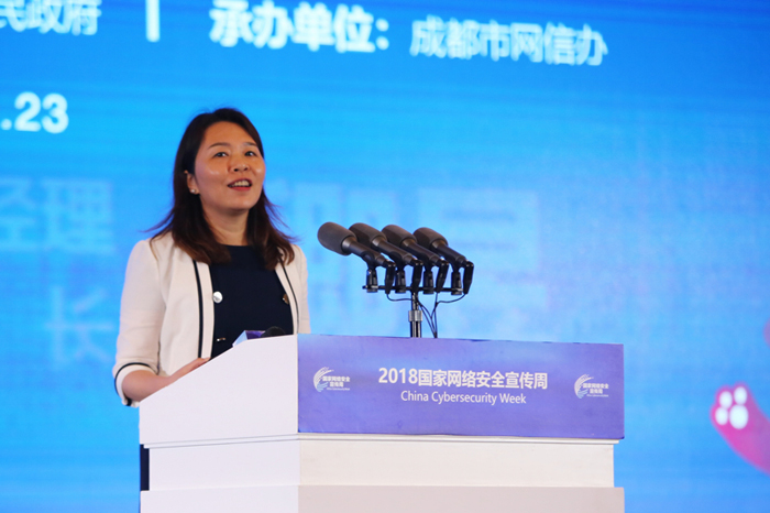 图为阿里巴巴集团首席风险官郑俊芳就《创新安全,护航数字经济》发表演讲。中国网信网 李旭 摄