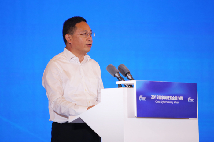 图为杭州安恒信息董事长范渊就《浅谈数字经济时代网络安全的角色演进》发表演讲。中国网信网 李旭 摄