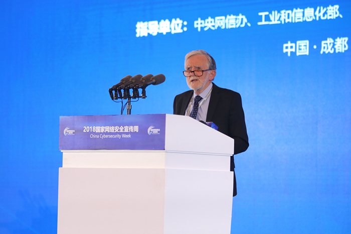 图为信息安全管理体系(ISMS)国际工作组创始人、主任爱德华·汉弗莱斯就《网络安全国际标准》发表演讲。中国网信网 李旭 摄