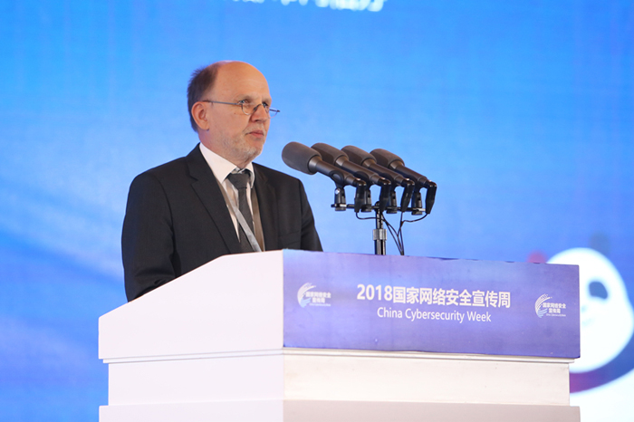 图为欧洲标准化委员会、欧洲电工标准化委员会分技术委员会主席沃尔特·福来博士就《欧洲网络安全监管全景图》发表演讲。中国网信网 李旭 摄