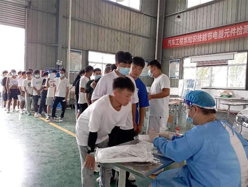 为确保到企业的师生疫情防控安全,企业派专车到校搭载学生,系部专门请核酸采样人员到校为学生和老师进行核酸采样检测。