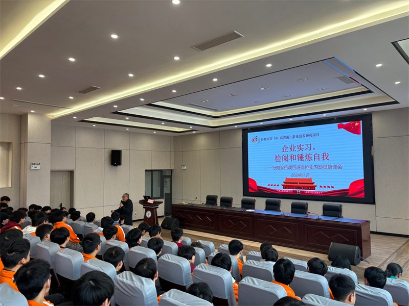 吴天林在会上作动员讲话。他对同学们作出四点要求和希望:一是同学们要从思想上、行动上重视岗位实习,尽快完成角色转变,从容应对岗位实习挑战;二是要树立安全第一的理念,确保顺利完成实习任务;三是要树牢纪律规矩意识,领会好、遵守好、落实好实习相关规定,切实履行好实习生职责;四是要不负青春、不负韶华、不负时代,明确目标方向,努力实现精彩人生。他号召同学们,要乐观向上、克难奋进,把岗位实习作为磨炼意志、增长才干的途径;要胸怀梦想、脚踏实地,以必胜的信心高质量完成岗位实习任务。